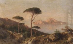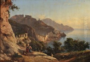 Amalfitanische Kustenlandschaft Mit Einem Fischerboot (+ Blick Auf Amalfi Im Fruhen Abendlicht, Oil On Canvas; Pair)