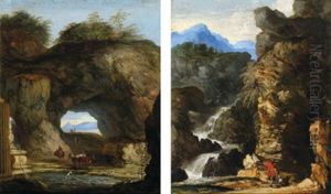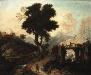 An Extensive Rocky Italianate Landscape With Figures On A Track, Travellers On A Bridge Beyond