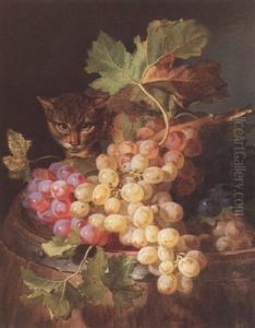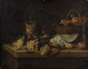 A Spaniel Confronting A Cat Amid A Still Life Of Kitchen Utensils