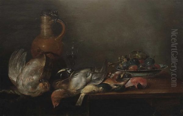 Stillleben Mit Erlegten Vogeln, Einem Weinkrug Weinglas Und Einer Schale Mit Pflaumen