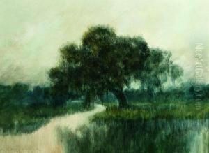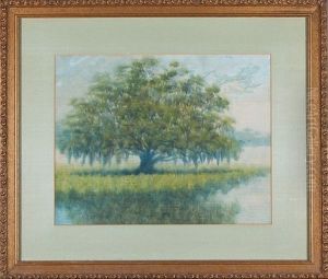 Bayou Landscape With Live Oak And Waterlilies