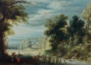 A Wooded River Landscape With Peasants With A Cart, And Travellers On A Path