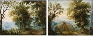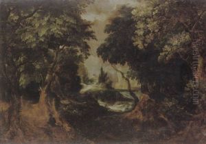 A Wooded River Landscape With A Peasant Couple Collecting Wild Produce And Water Beside A Waterfall