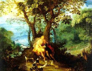 Landskap Med Kurtiserande Par, I Bakgrunden Jagare Med Hundar Och Simmande Hjort
