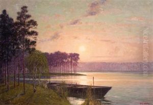Kustenlandschaft Bei Sonnenuntergang Mit Kahn Im Priel Und Figurenstaffage