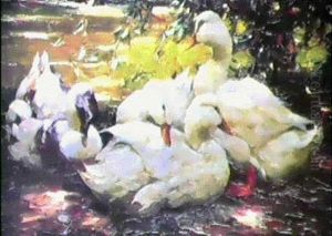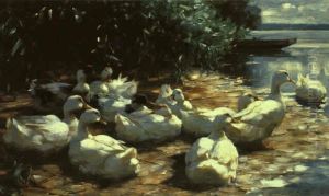 Im Schatten. Vier Weisse Enten Unter Weidenbaumen Am Wasser