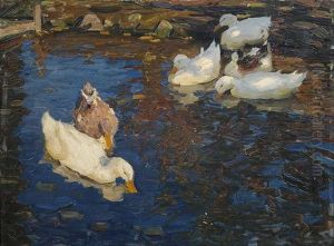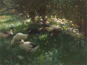 Children And Geese In A Lakeside Meadow
