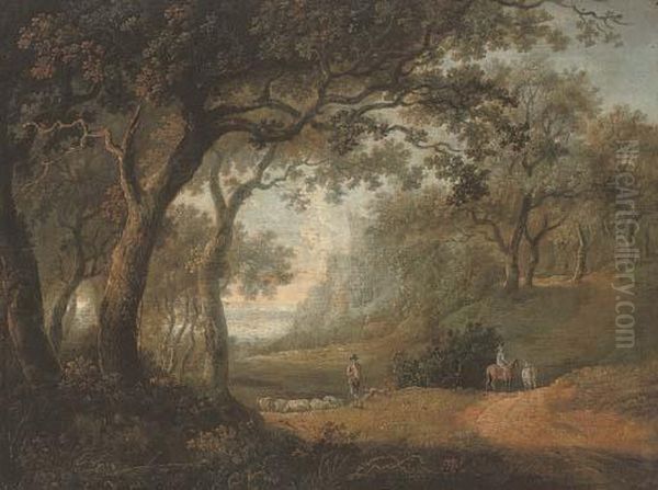 A Wooded Landscape With A Shepherd And His Flock, And A Figure Riding On A Track