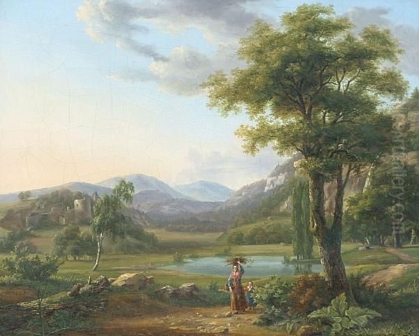 Woman And Child Carrying Firewood In A Romantic Landscape
