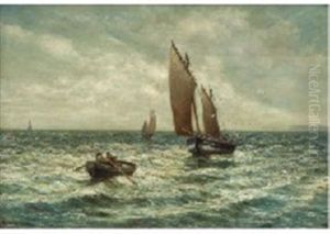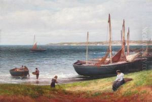 'unloading The Catch' With Figures And Fishing Boats On A Shoreline