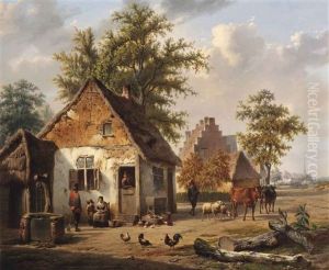 Figures In A Village Street With A River Beyond