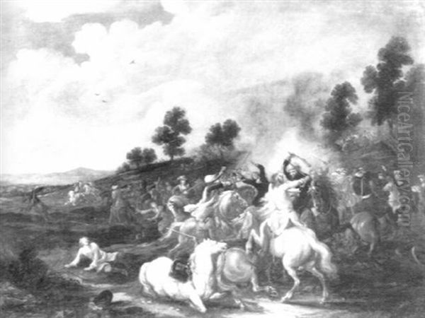 Reitergefecht In Einer Bewaldeten, Hugeligen Landschaft