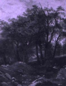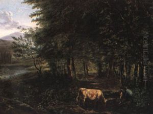 Paysage Avec Montagne, Etang Et Deux Cerfs
