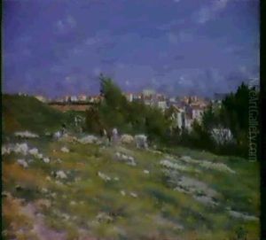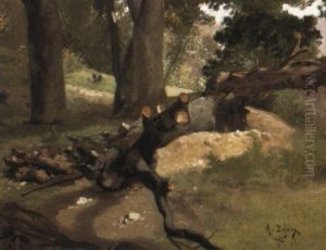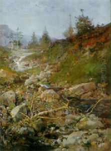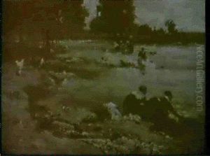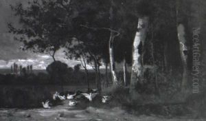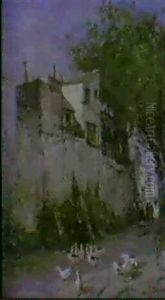 A Shepherd Tending To His Flock With A Country Cottage In The Distance