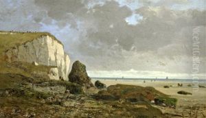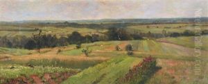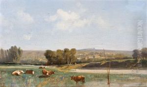 A Shepherd Tending To His Flock With A Country Cottage In The Distance