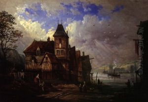 Idyllisches Kirchdorf Am Flus. Am Ufer Wascherinnen Bei Ihrem Tagewerk