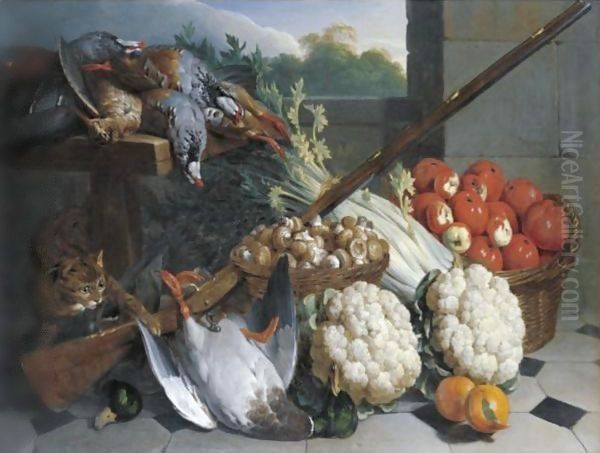 A Still Life Of Game With A Musket, Baskets Of Apples And Mushrooms, A Bunch Of Celery, Two Cauliflowers And A Cat