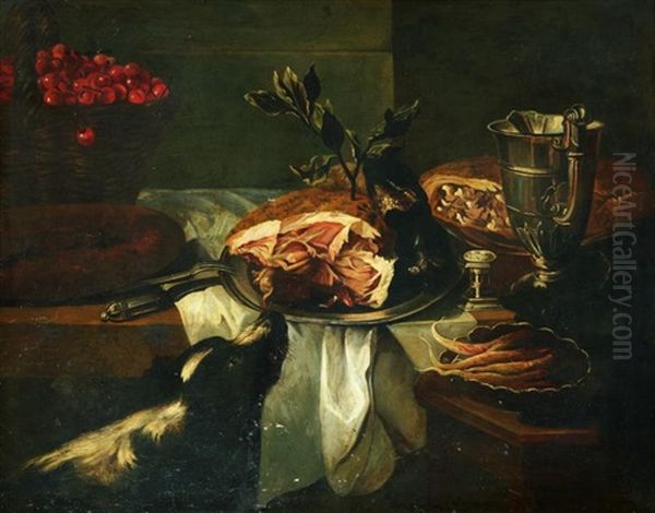 Chien Flairant Un Jambon Pose Sur Un Entablement A Cote D"un Panier De Cerises Et D"une Aiguiere En Argent