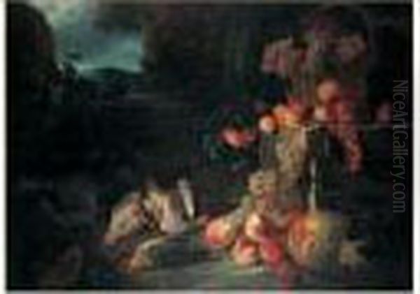 Nature Morte Au Panier De Raisins, Abricots,peches Et Perdrix Sur Fond De Paysage