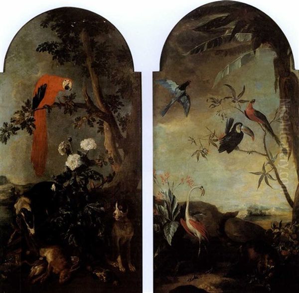 Trophee De Chasse Surveillie Par Deux Chiens Dans Un Paysage Avec Un Perroquet (+ Paysage Anime De Volatiles Avec Un Tapir; Pair)
