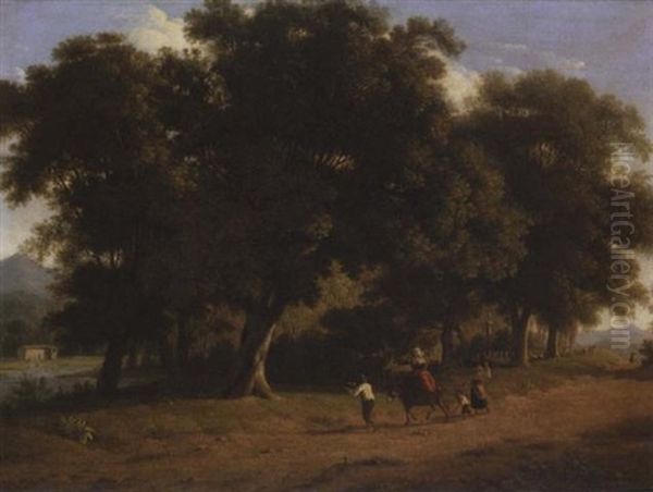 An Italianate Landscape With Figures And Their Donkey On A Road Before A Copse
