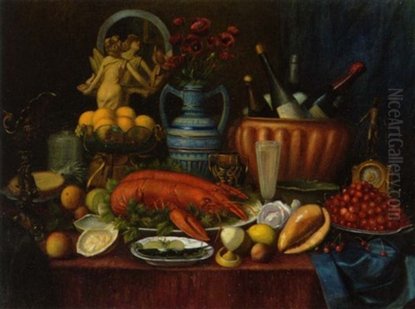Opstilling Med Hummere, Vinflasker, Konkylie, Kirsebaer, Blomstervase Og Spejl Pa Et Bord