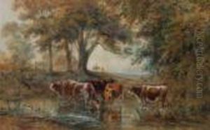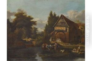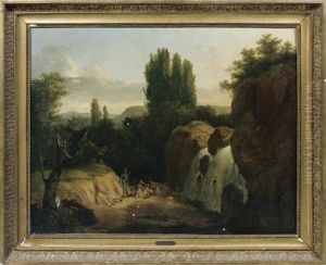 An Extensive Landscape With A Peasant Girl And A Shepherd Resting By A Path, With Cattle Watering At A Stream, A Village Beyond