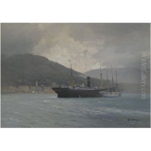 Dampfer Und Segelschiff Vor Einer Kuste