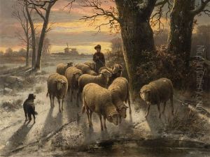 A Shepherd Herding Sheep Through A Winter Landscape
