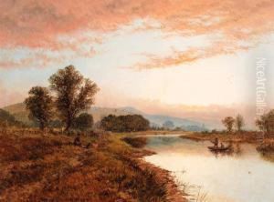 Woodland Scene With A Woodcutter Standing Beside A Pile Of Logs, With A Pair Of Horses And A Cart Behind.