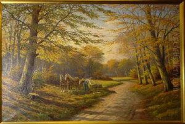 Woodland Scene With A Woodcutter Standing Beside A Pile Of Logs, With A Pair Of Horses And A Cart Behind.