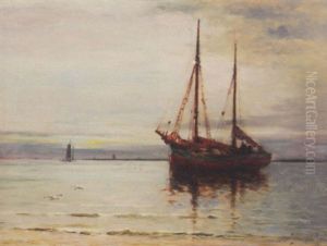 Scene Fra Wales Med Kvaeg Ved Vandingsstedte, Solnedgang