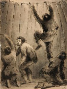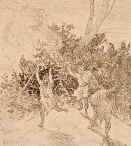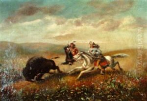 Hunters Escaping From A Wounded Buffalo, While He Tears Their Clothes To Pieces