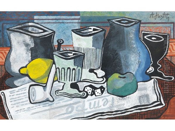 Stillleben Mit Vasen, Bechern, Pfeife, Zitrone, Wurfeln Und "tempo"-zeitung