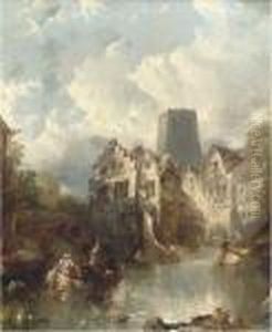 Busy River Scene With Boats, Figures And Windmill