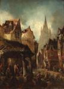 Continental Street Scene With Market Stalls And Figures