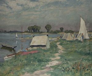 Sommertag Am Niederrhein. Vorn Am Ufer Fischer Vor Ihrer Kate, Am Horizont Ein Kleines Kirchdorf