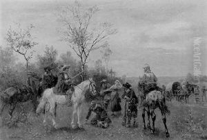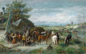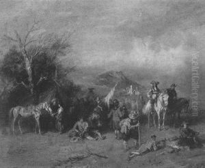 Scene Fra Militaerlejr Med Soldater Som Drikker Og Pudser Vaben, I Forgrunden Soldater Til Hest, I Baggrunden By