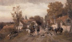 Jagdgesellschaft Zu Pferd In Hugeliger Landschaft Mit Schlosshintergrund