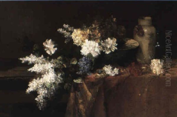 Lilacs, Carnations, A Glass Ewre And Vases On A Table Top