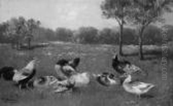 A. "huhner Und Enten Auf Einer Wiese". Sign. Und Bez. Munchen. Ol Auf Lwd. 15,5 X 25 Cm. Rahmen