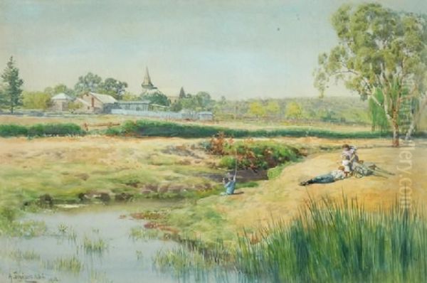 Children Fishing By The Stream