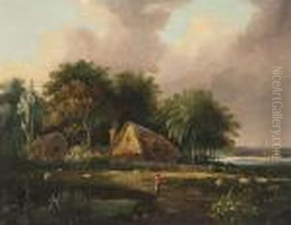 Figure And Sheep Before Woodland Cottages