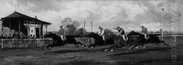 "beim Pferderennen". Sign. Mit Pseudonym Derfla. Ol Auf Holz. 16 X 43,5 Cm. Rahmen