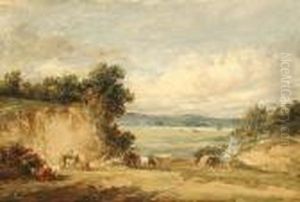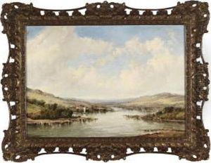 An Extensive River Landscape With Cattle At The Water's Edge.