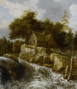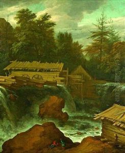 A Scandinavian Wooded Landscape With A Watermill, Three Figures Beside A Waterfall In The Foreground
