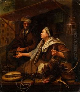 River Scene With A Masted Boat Unloading Its Goods And A Figure Punting In The Foreground