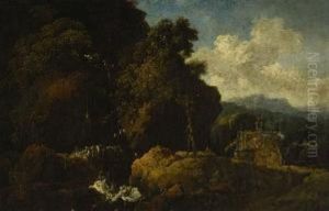 A Mountainous Wooded Landscape With A Cottage By A Waterfall