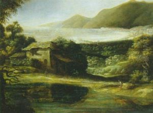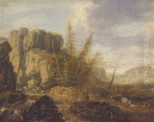 A Rocky Riverlandscape With Peasants Gathering Wood, Hilltop Houses And Mountains Beyond