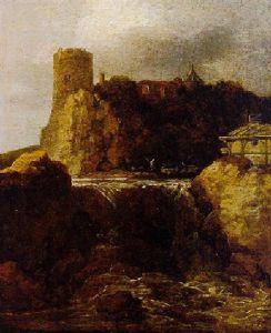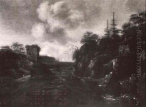 A Wooded River Landscape With Figures On A Bridge Before A Cottage